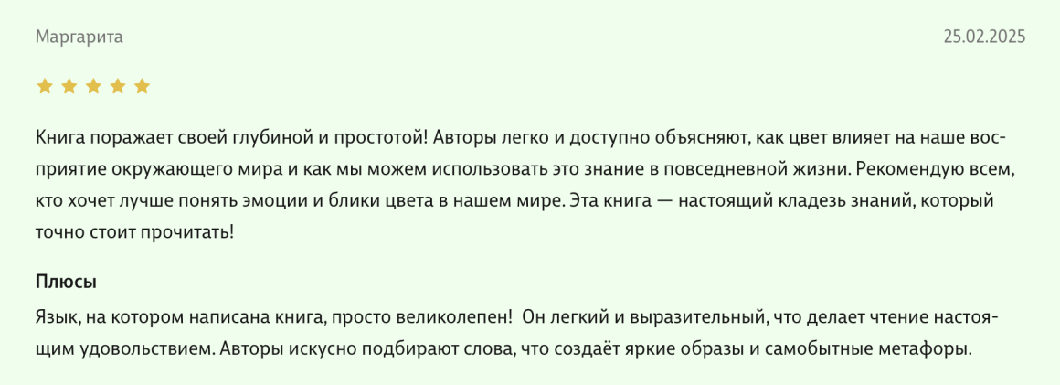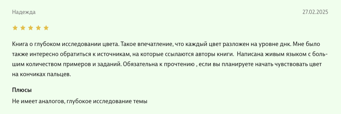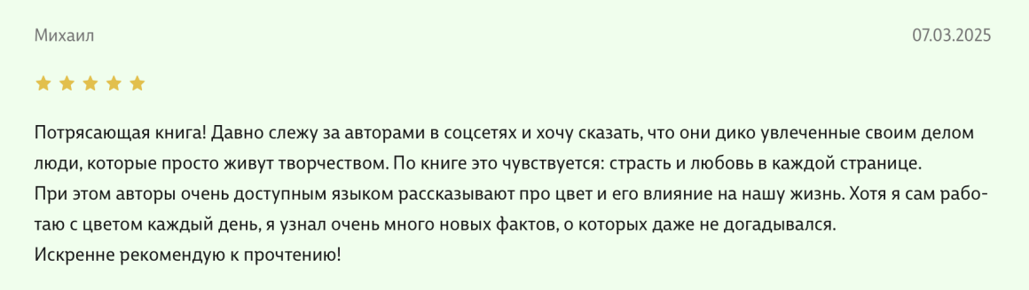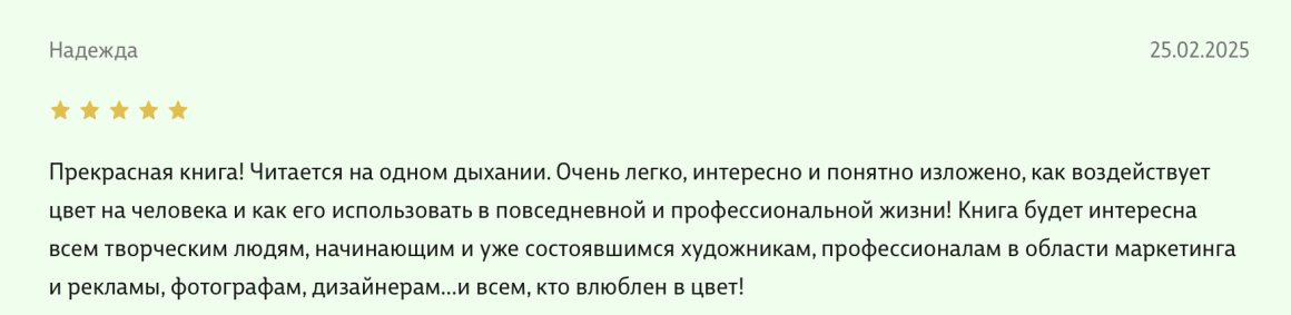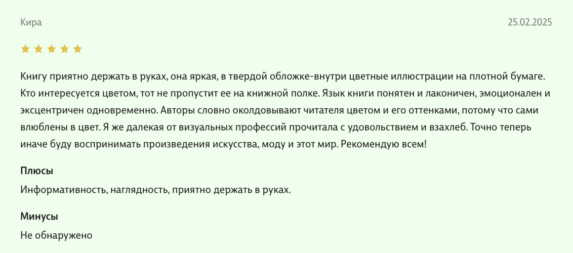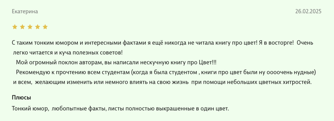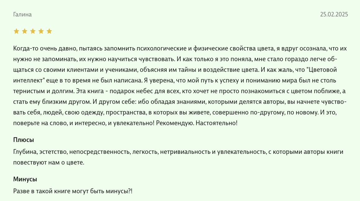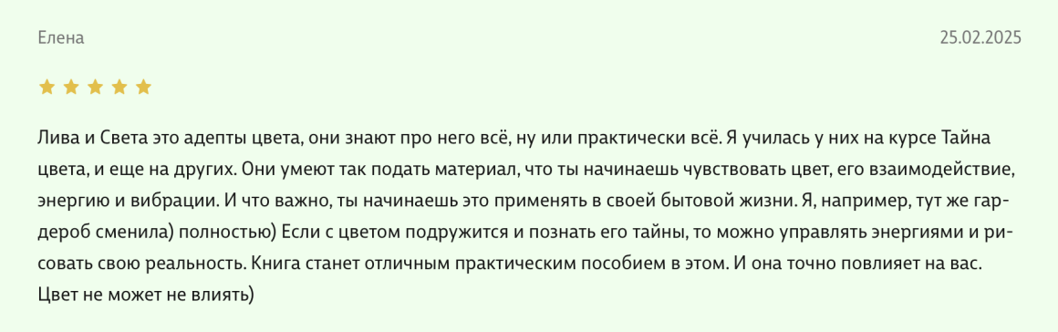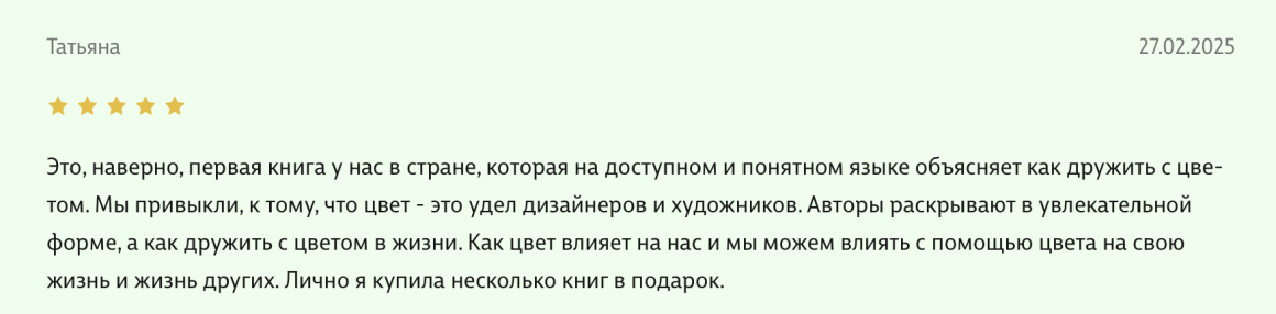 Здравствуйте, уважаемые авторы великолепной книги - Света Максимова и Лива Тагира. Хочу выразить благодарность от всей души за ваш труд в написании книги "Цветовой интеллект"! Во время обучения на дизайнера одежды в Talentsy мне повезло быть участником вебинара, проводимого Вами, где вы анонсировали скорый выход в свет книги. Я сразу поняла, что это то, что мне нужно)