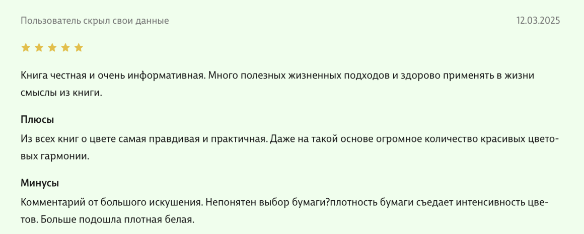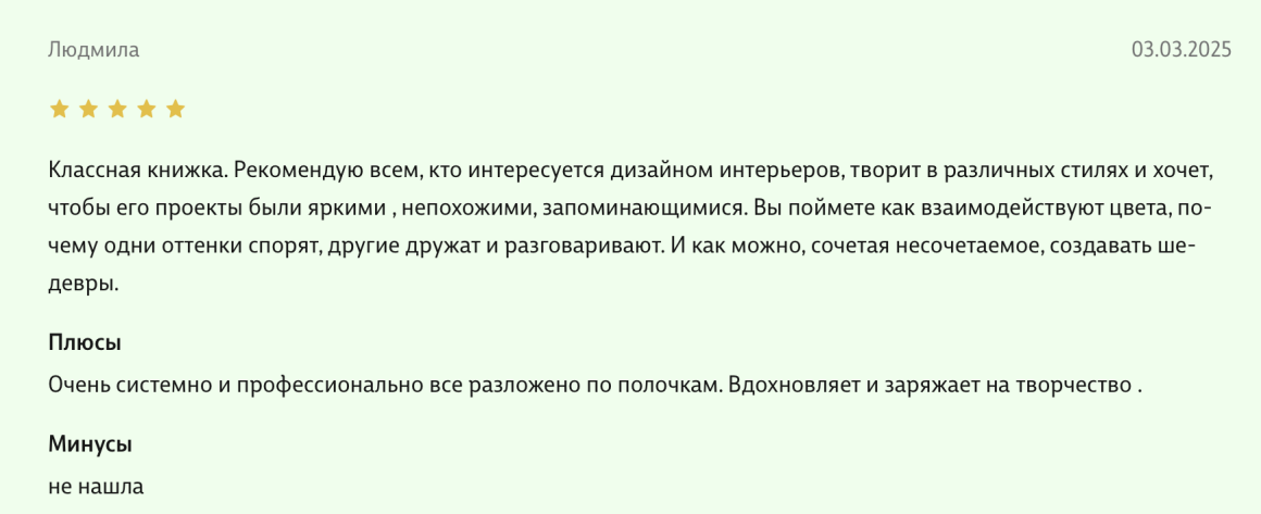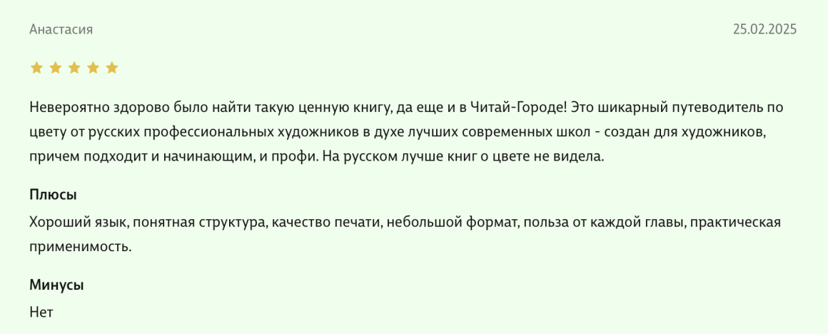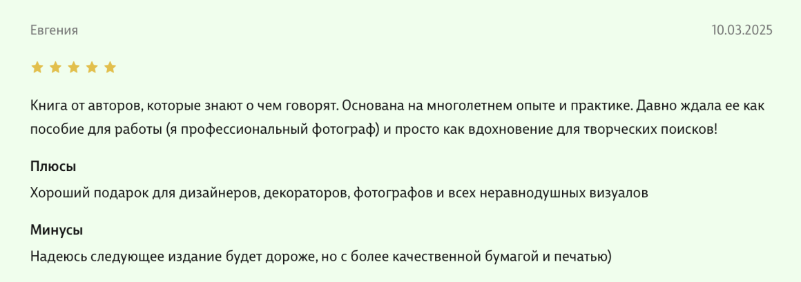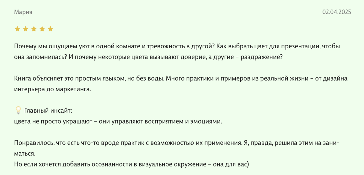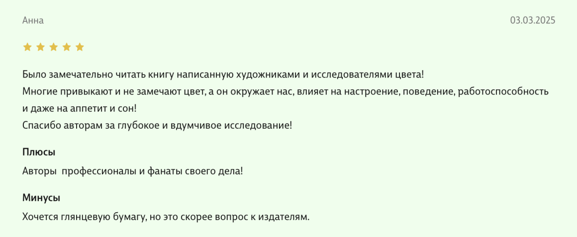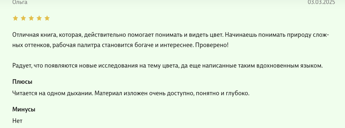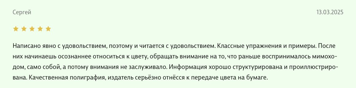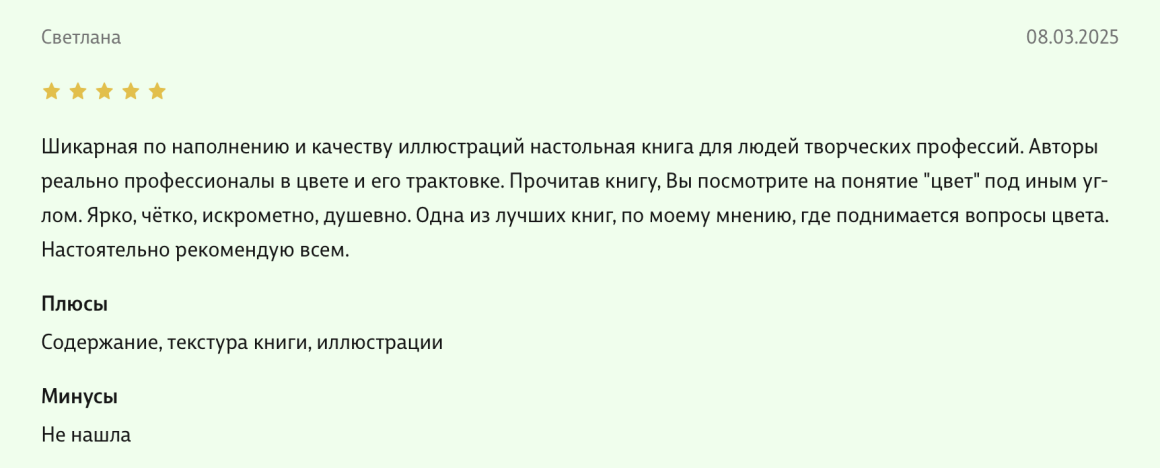 Здравствуйте, уважаемые авторы великолепной книги - Света Максимова и Лива Тагира. Хочу выразить благодарность от всей души за ваш труд в написании книги "Цветовой интеллект"! Во время обучения на дизайнера одежды в Talentsy мне повезло быть участником вебинара, проводимого Вами, где вы анонсировали скорый выход в свет книги. Я сразу поняла, что это то, что мне нужно)